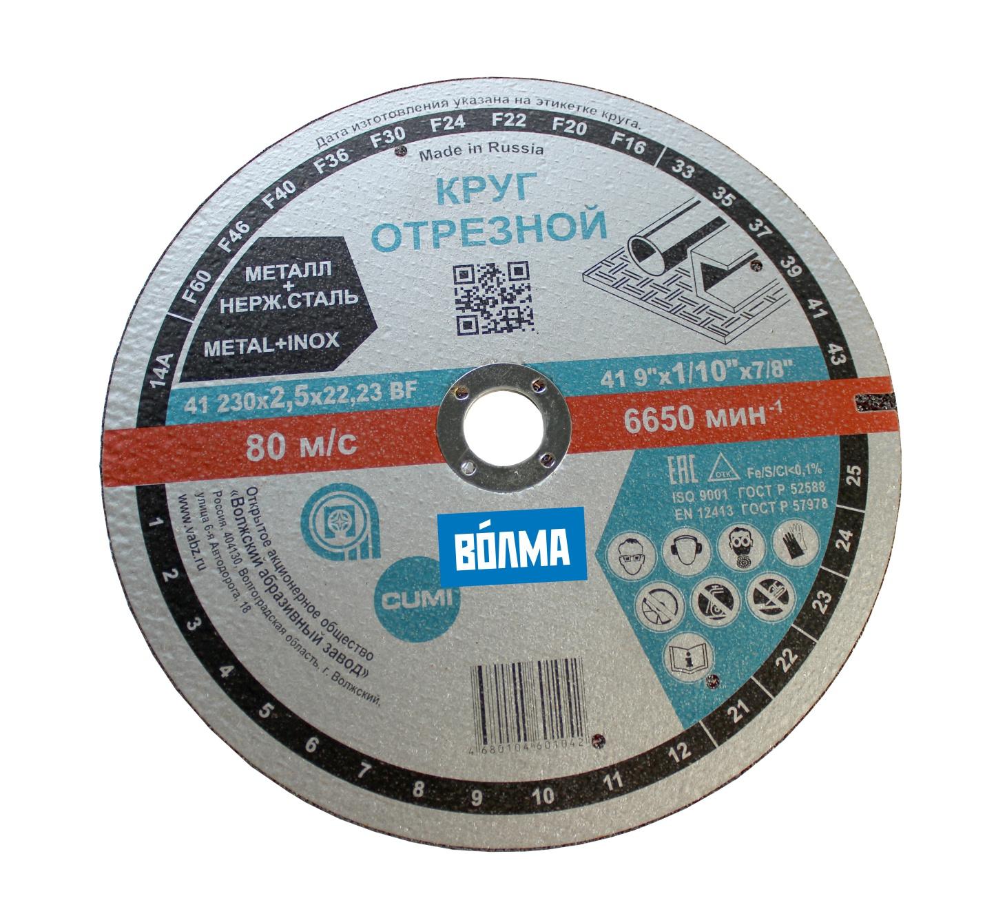 Круг отрезной по металлу 230х2,5х22,23 мм ВАЗ – это абразивный инструмент на основе смолы и шлифзерна, армированный сеткой из стекловолокна.